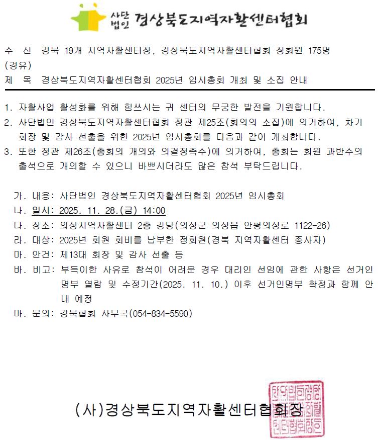 경상북도지역자활센터협회 2025년 임시총회 개최 및 소집 안내