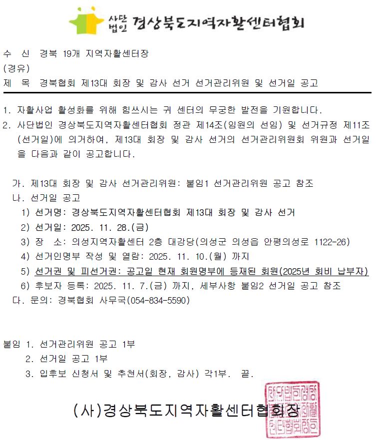 경북협회 제13대 회장 및 감사 선거 선거관리위원 및 선거일 공고
